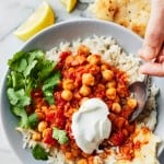 Serve the chana masala with lemon wedges for squeezing and more cilantro for garnish. I also like to top mine with a dollop of Greek yogurt, though this is completely optional. Without it, the recipe is vegan.