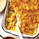 Finally, bake the butternut mac and cheese. Transfer it to an oiled 9×13-inch or similar baking dish, and top with the panko. Broil until the topping is crisp and browned.