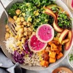 Cozy roasted sweet potatoes, chickpeas, and brown rice make this bowl hearty and satisfying. I round it out with massaged kale, radishes, carrots, and cabbage, but all sorts of veggies would work here. Experiment with roasted cauliflower, broccoli, or butternut squash!