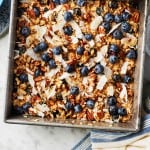 This blueberry baked oatmeal is made with healthy ingredients—think fresh fruit, almond butter, and whole rolled oats—but it tastes like a treat. The top is toasty and nutty, featuring a layer of pecans and coconut flakes that crisp up beautifully in the oven. The middle, on the other hand, stays soft and creamy, filling each bite with an amazing mix of textures. It’s lightly sweet, warmly spiced, and studded with bursty blueberries throughout. Go ahead, get a second slice.